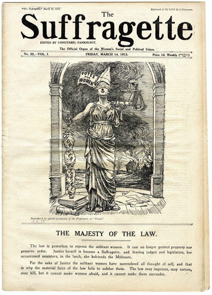 Edited by Christabel Pankhurst, a key figure in the suffragette movement and co-founder of the WSPU. This portion states: “The law is powerless to repress the militant women. It can no longer protect property nor preserve order. Justice herself is become a Suffragette, and leaving judges and legislators, her accused ministers, in the lurch, she befriends the Militants. For the sake of Justice the militant women have surrendered all thought of self, and that is why the material force of the law fails to subdue them. The law may imprison, may torture, may kill, but it cannot make women afraid, and it cannot make them surrender.” Source: https://www.nationalarchives.gov.uk/education/resources/suffragettes-on-file/the-suffragette-newspaper/Source: Votes for Women supplement cover of 10 October 1907, Wikipedia.
